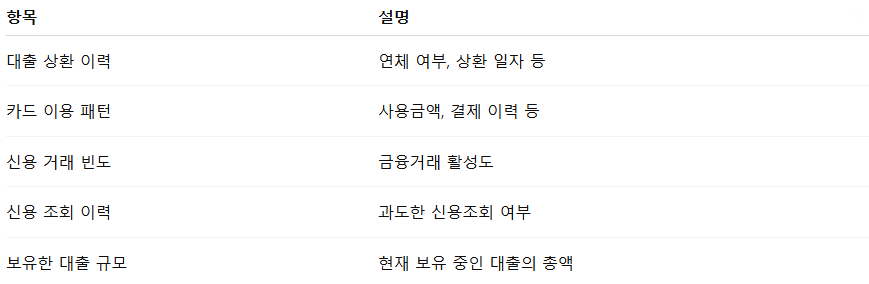 왜냐하면 신용점수는 아래와 같은 항목들을 기반으로 산정되기 때문입니다.